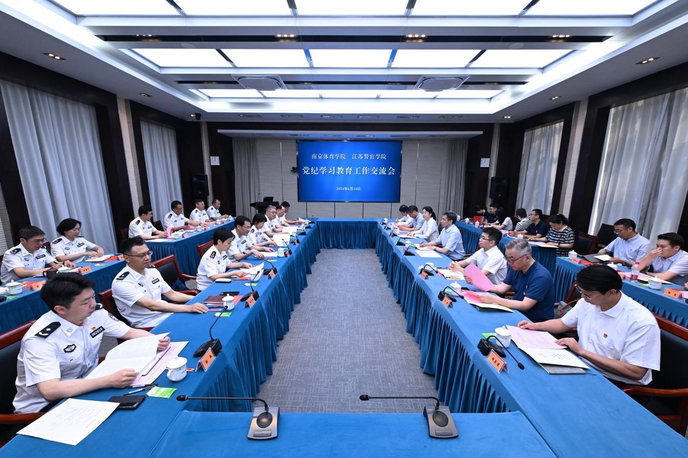 交流中,两校领导分别介绍了各自办学治校和学院建设发展情况,围绕加强党的政治建设与纪律建设、党纪学习教育、特色化办学等方面工作进行深入交流。夏存喜介绍了beat365中文官方网站坚持党的绝对领导全面领导,围绕立德树人、铸魂育警根本任务,以党的政治建设统领推进办学治校,开展忠诚警魂教育、推进全面从严管党治警、锻造“四个铁一般”过硬队伍、服务平安建设与高质量发展等具体举措和取得的成绩。刘红明介绍了南京体育学院坚持双轮驱动、承担双重使命,探索形成独树一帜的教学、训练、科研“三位一体”“南体模式”,为党育人、为国育才、为国争光,为建设体育强国作出的贡献。