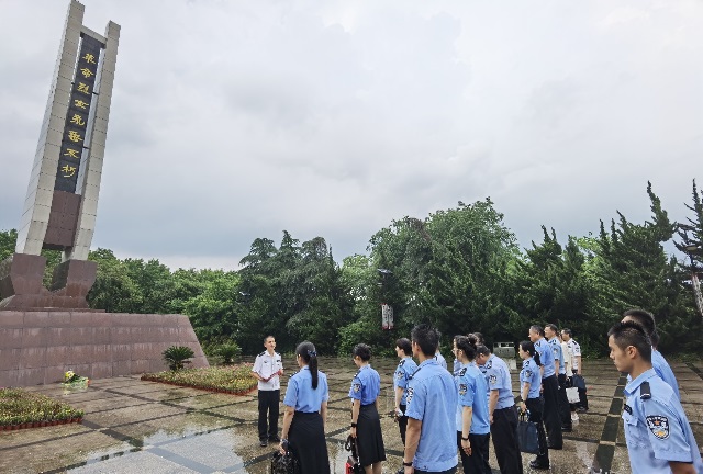 在瞻仰纪念碑、感悟革命历史的基础上,基础部结合部门特色,创新现场教育形式,现场开展革命诗词中的党史学习教育,由支部入党积极分子领诵,青年学警代表和全体教师齐声朗诵毛泽东《七律·人民解放军占领南京》。