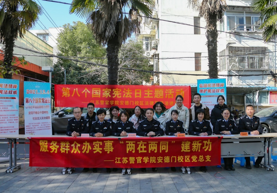 开展党史学习教育以来,安德门校区党总支积极响应号召,与瑞金路街道共建,发挥法学专业优势,组织党员干部教师深入社区宣讲习近平法治思想,开展普法、送法等活动,参与社区疫情防控,在12348公共法律服务中心设立党员工作站进行常态化法律咨询服务,先后为街道居民提供法律服务百余人次,热心为民服务办实事,积极投身“两在两同”建新功行动。